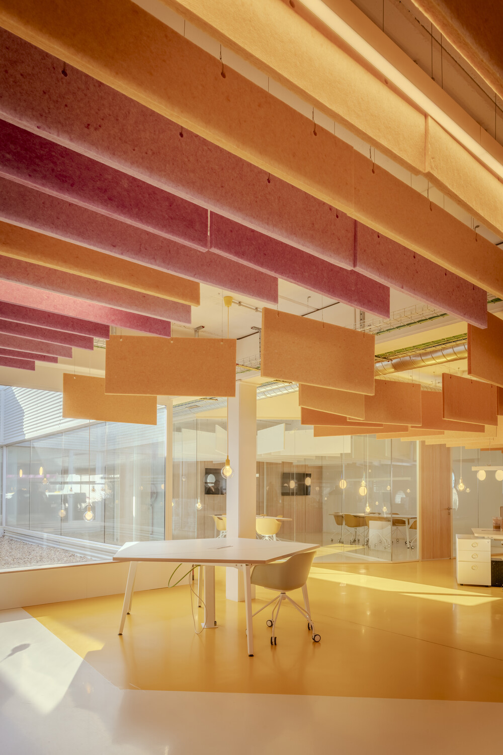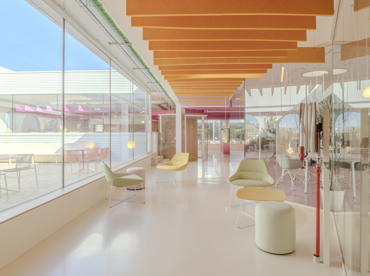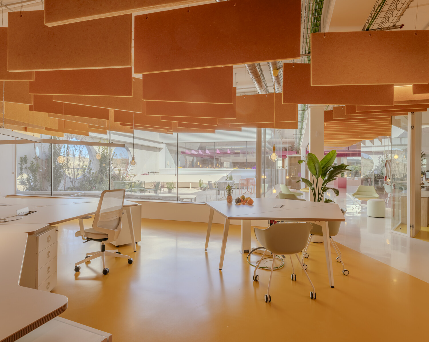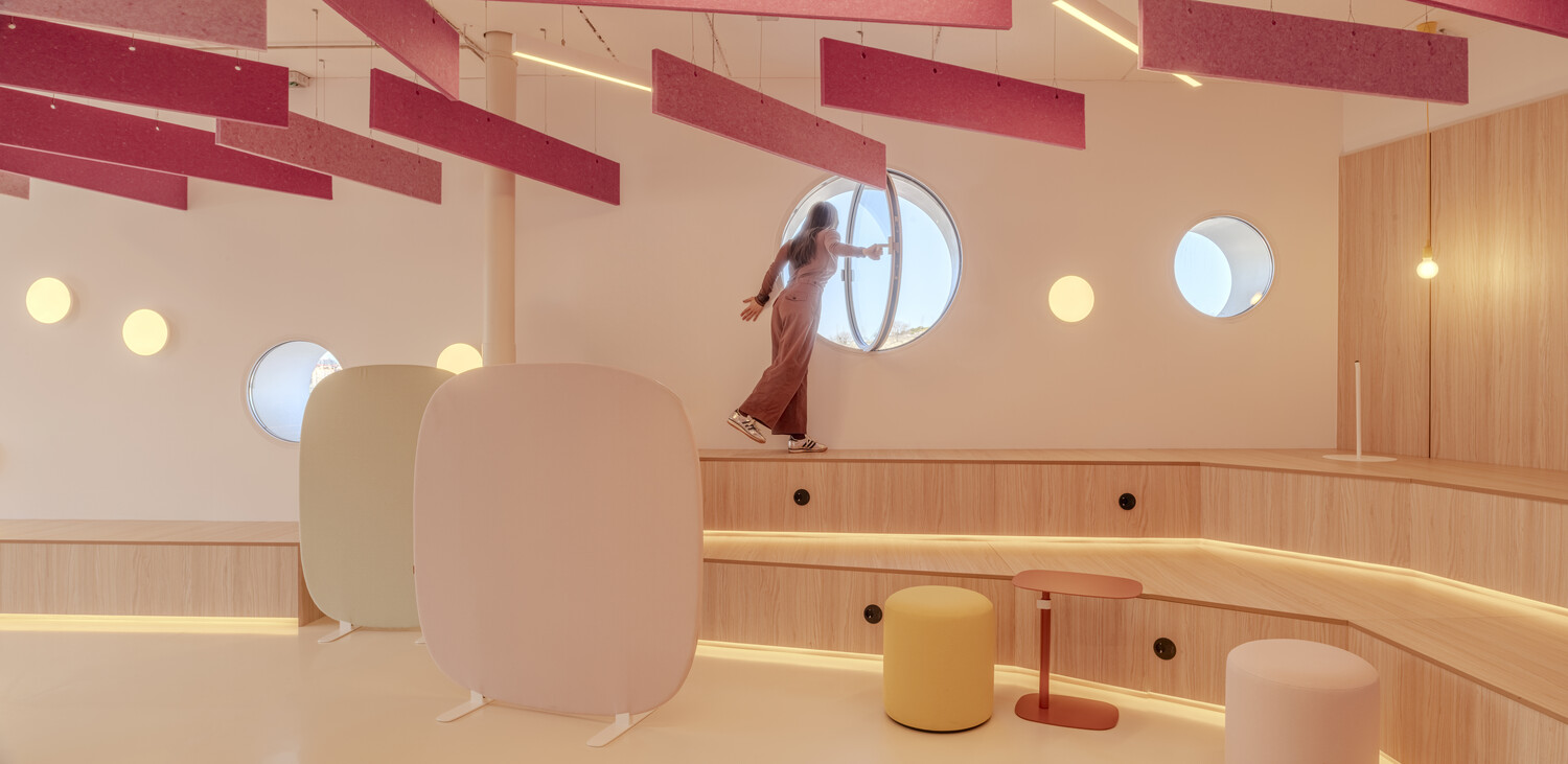 La flexibilidad es el eje central del diseño: las oficinas son abiertas y polivalentes, con zonas destinadas tanto al trabajo individual como al colaborativo. La configuración espacial con patios de luz y vegetación permite que las actividades cotidianas se mezclen con eventos a gran escala, desdibujando los límites tradicionales entre funciones. Esta hibridación estimula la creatividad y refuerza la identidad corporativa, a la vez que mejora la experiencia diaria de los trabajadores.