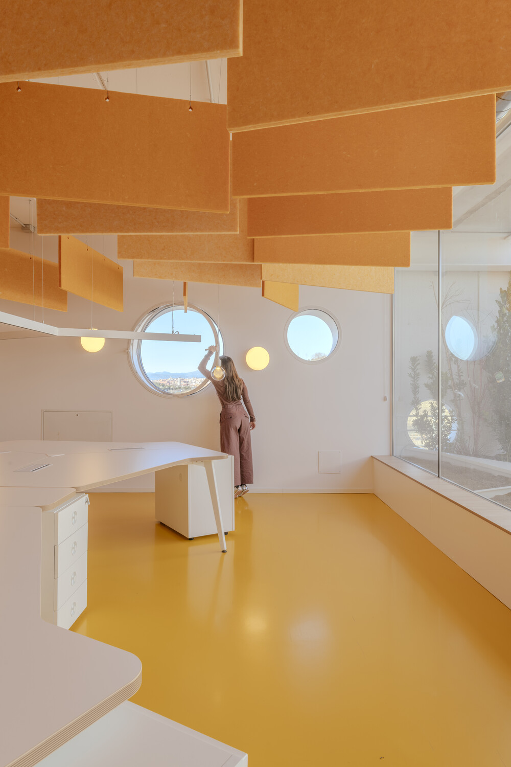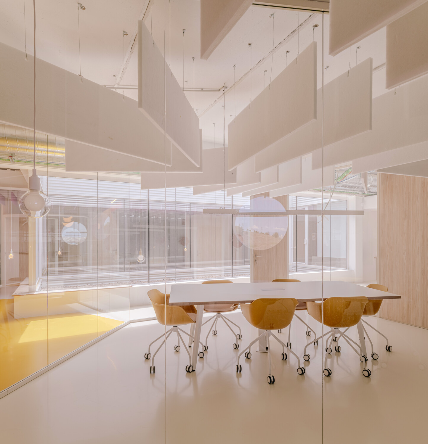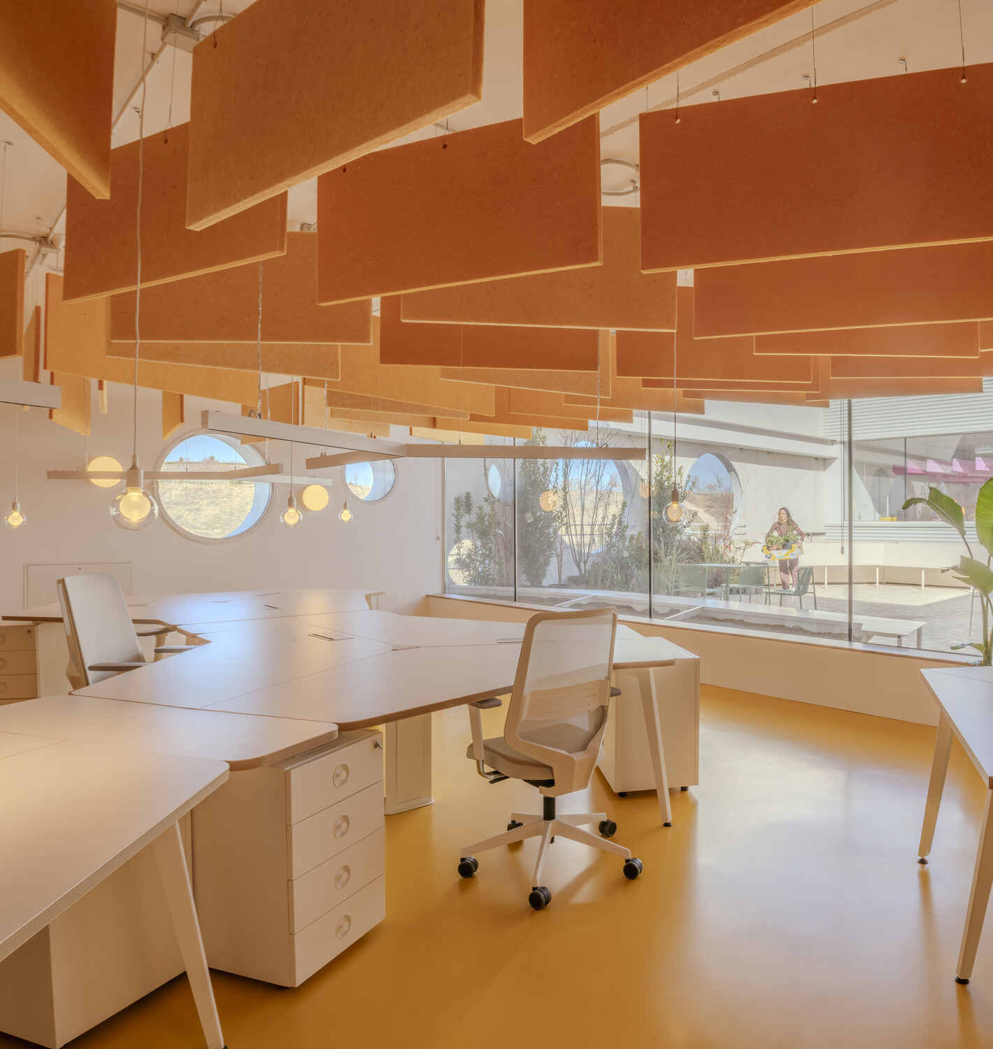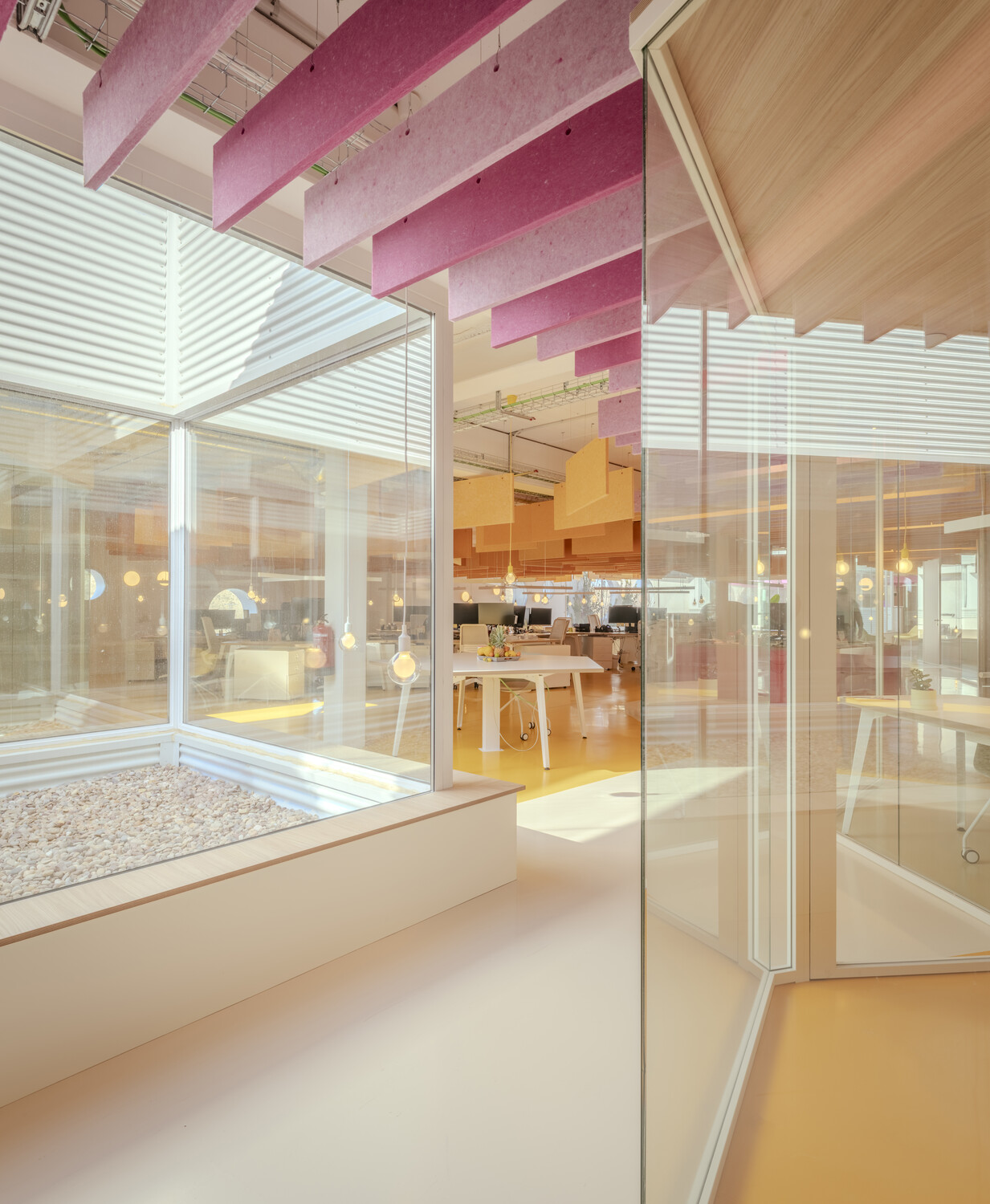 La flexibilidad es el eje central del diseño: las oficinas son abiertas y polivalentes, con zonas destinadas tanto al trabajo individual como al colaborativo. La configuración espacial con patios de luz y vegetación permite que las actividades cotidianas se mezclen con eventos a gran escala, desdibujando los límites tradicionales entre funciones. Esta hibridación estimula la creatividad y refuerza la identidad corporativa, a la vez que mejora la experiencia diaria de los trabajadores.