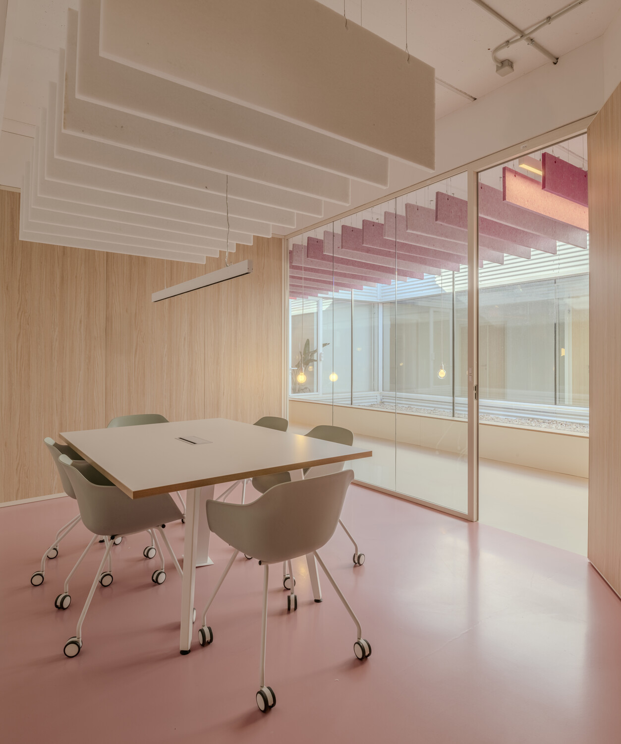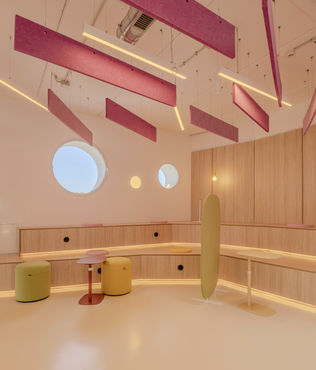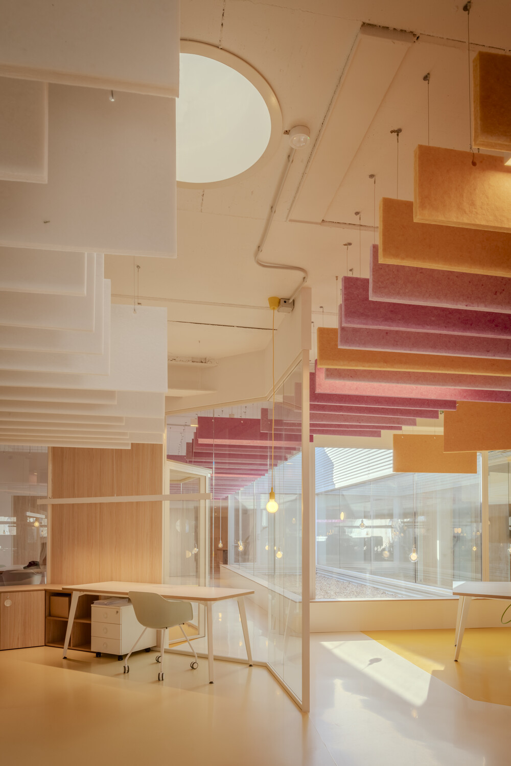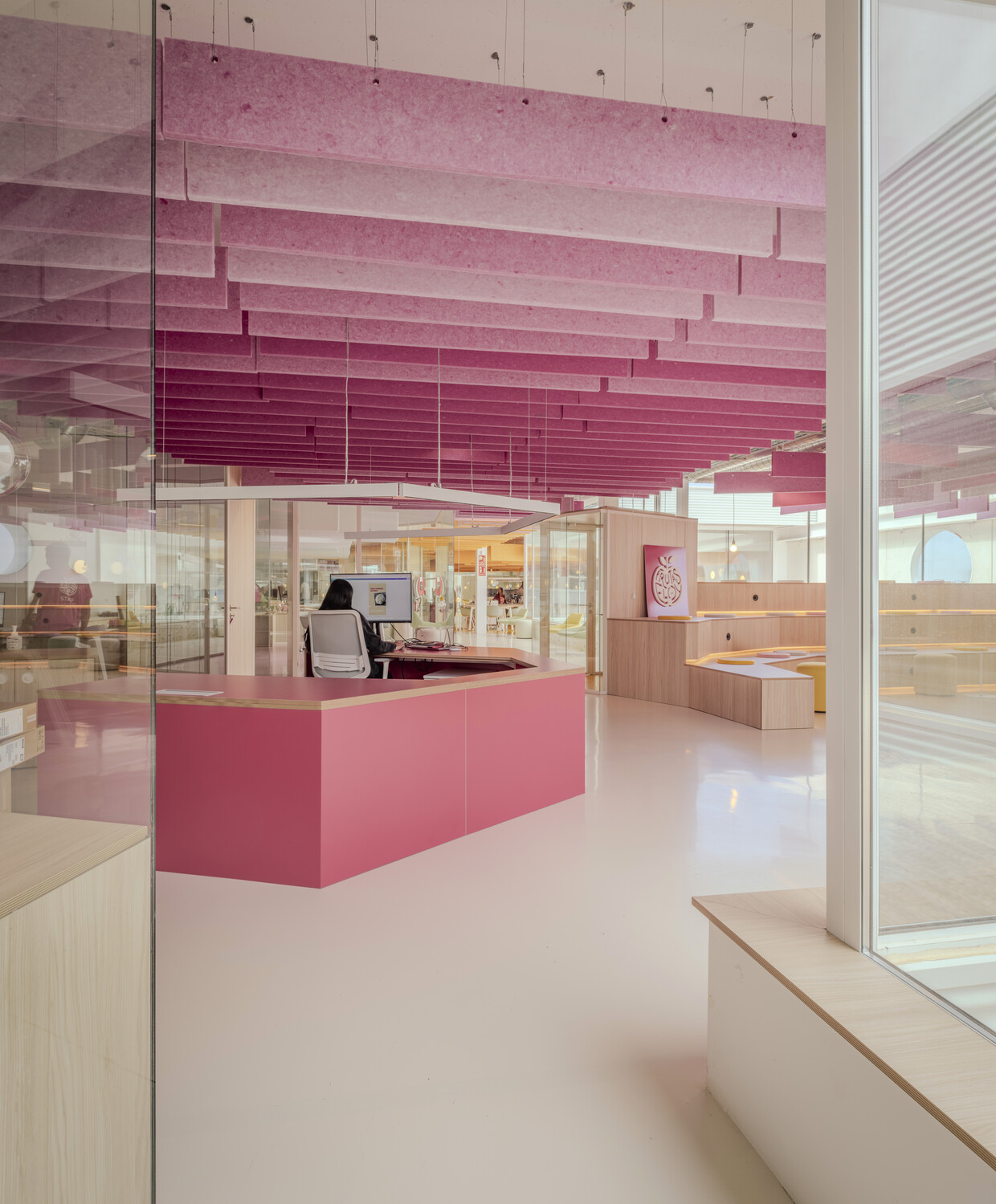 La flexibilidad es el eje central del diseño: las oficinas son abiertas y polivalentes, con zonas destinadas tanto al trabajo individual como al colaborativo. La configuración espacial con patios de luz y vegetación permite que las actividades cotidianas se mezclen con eventos a gran escala, desdibujando los límites tradicionales entre funciones. Esta hibridación estimula la creatividad y refuerza la identidad corporativa, a la vez que mejora la experiencia diaria de los trabajadores.