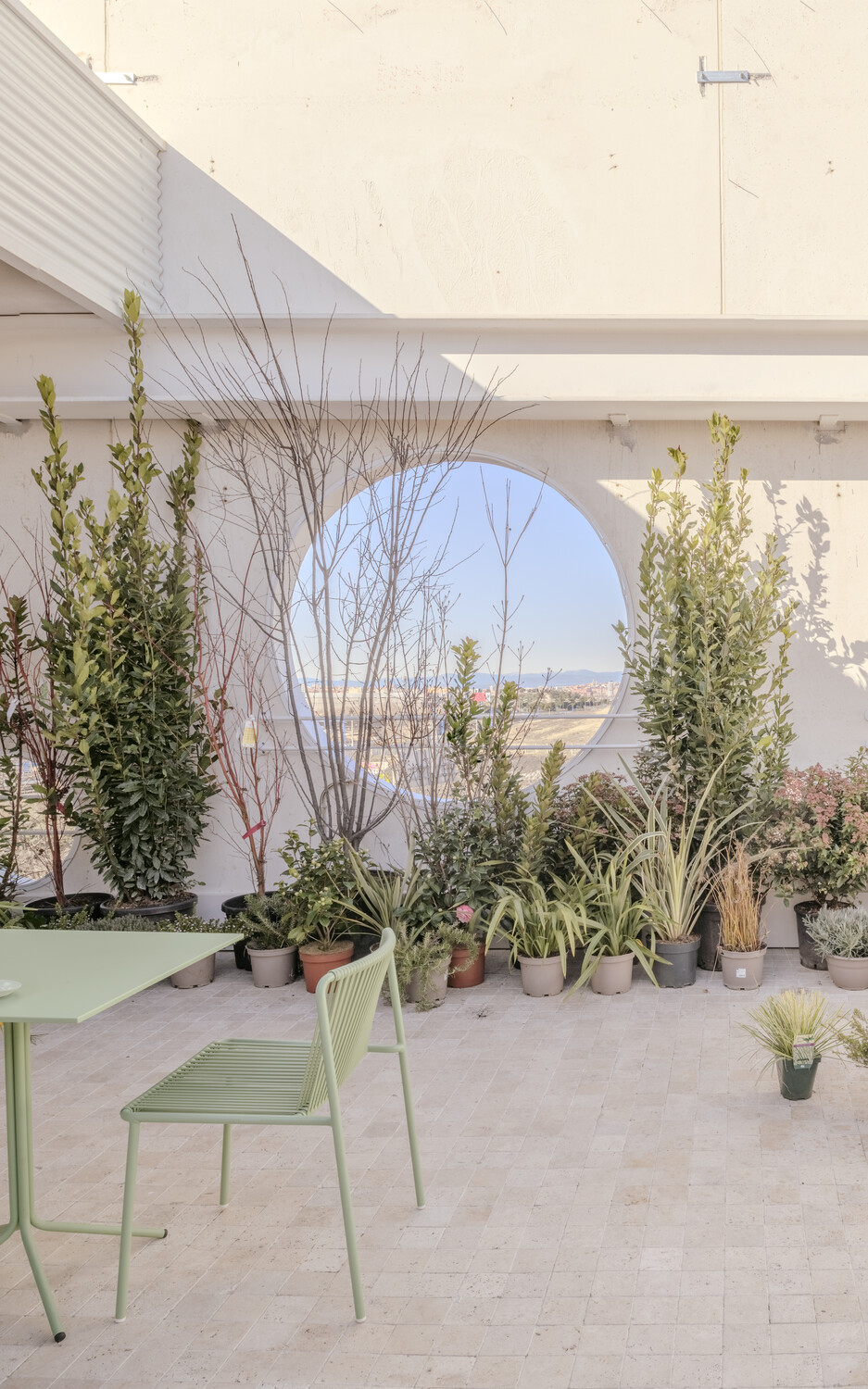 Sobre este complejo sistema industrial se plantea una pieza alargada en una planta de 82 metros de largo y una anchura de 19 metros. Nuestra incorporación en el proyecto industrial plantea dos interferencias, la fachada y las oficinas. Esta fachada singular le dota de carácter identitario. Se configura con piezas prefabricadas de hormigón blanco rayado verticalmente con perforaciones circulares desde los que poder ver el horizonte madrileño. La luz natural invadirá el interior con 4 patios, uno de ellos de sociabilización para reuniones y descansos a cielo abierto con un gran jardín. Estas oficinas representan una nueva visión sobre cómo los espacios de trabajo pueden fomentar creatividad, bienestar y sostenibilidad, mientras fusionan usos en un concepto integrador.