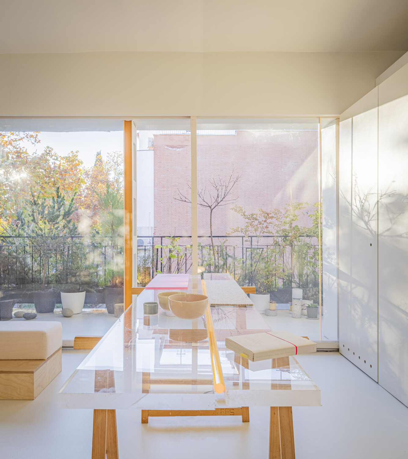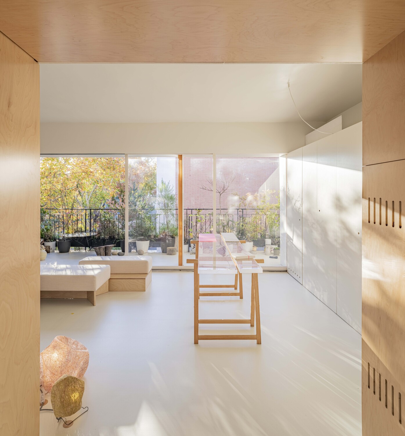 La luz actúa como materia estructurante de los espacios. Una luz que cambia a lo largo del día y a lo largo del año gracias al filtro de vegetación que se adapta a los colores y frondosidades propias de cada estación.