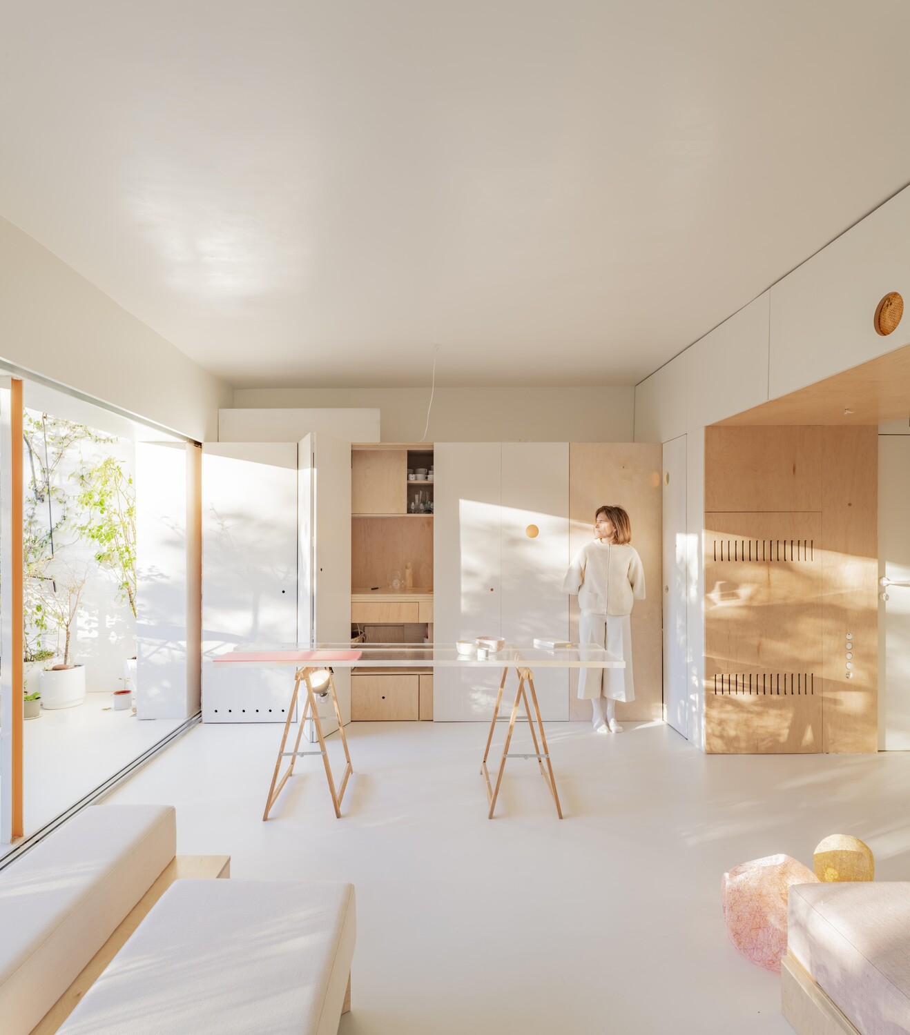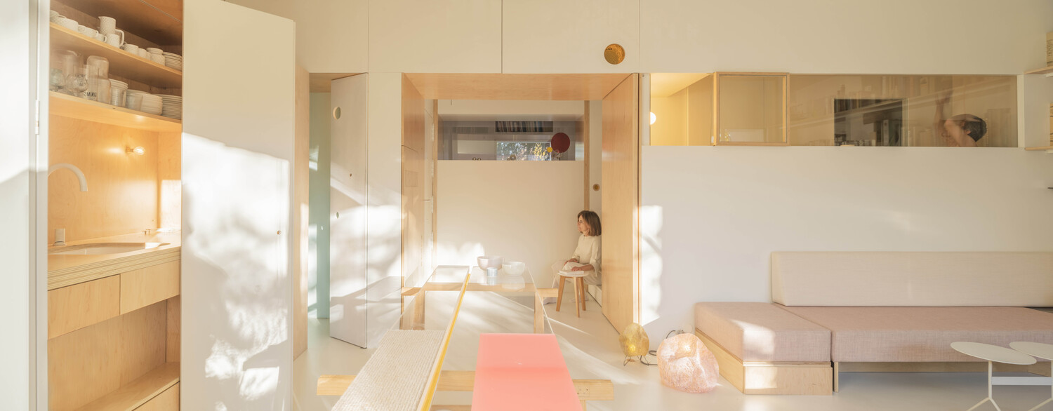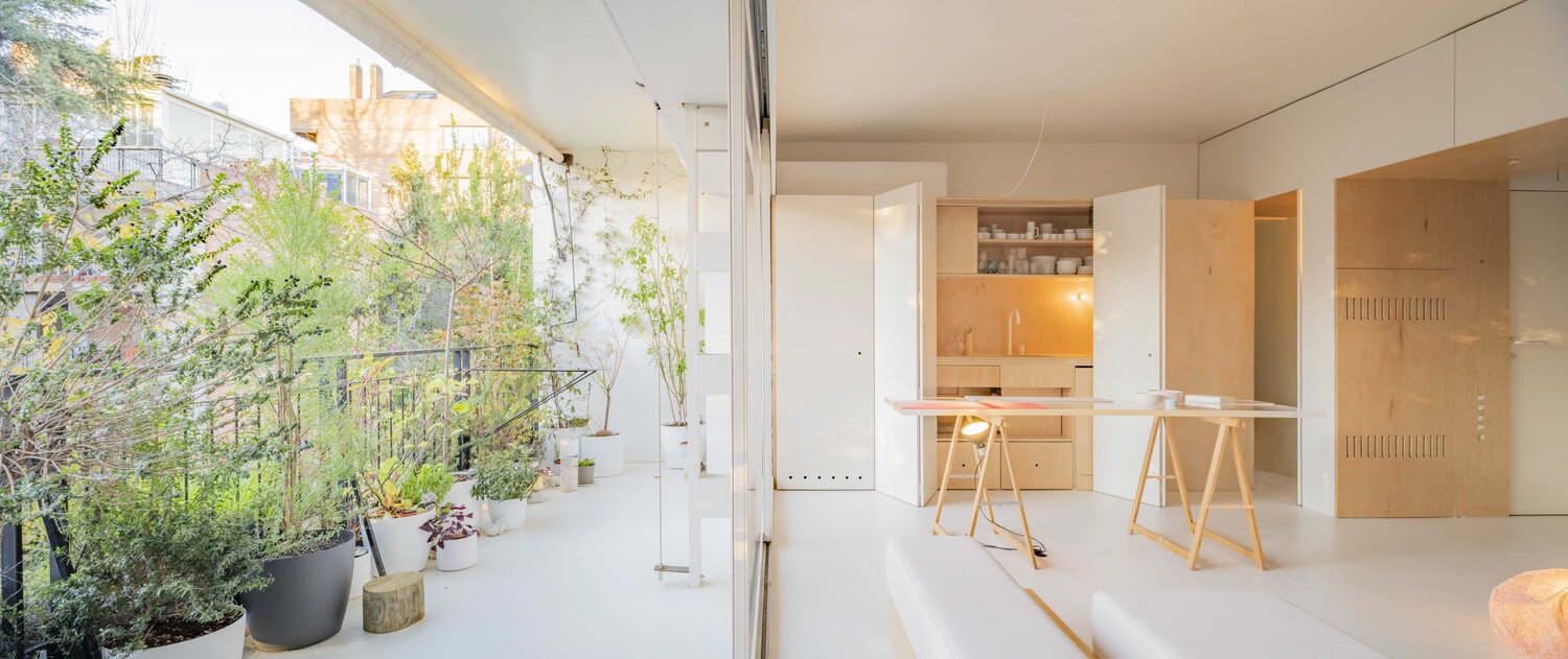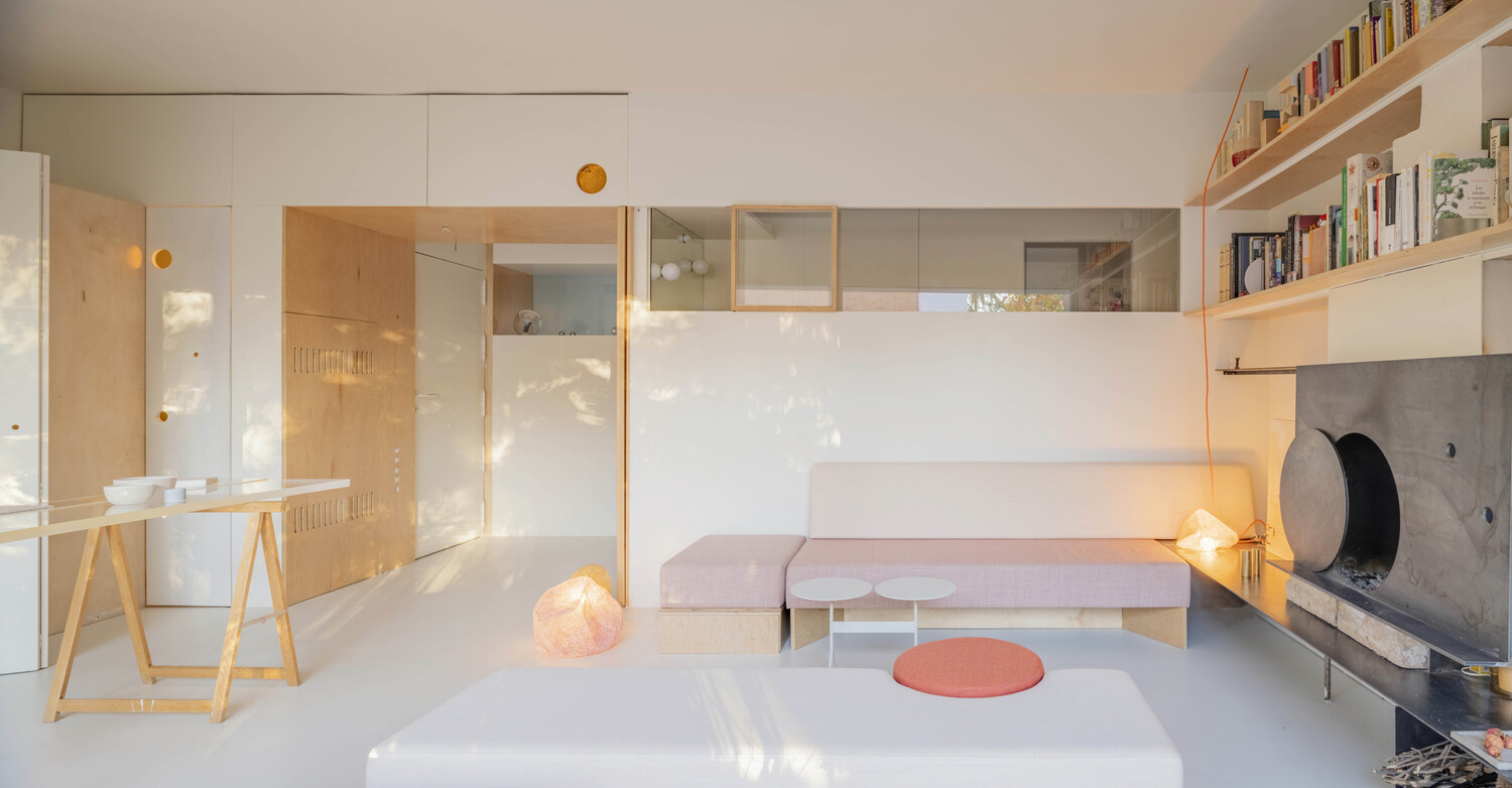 Una luz que atraviesa la casa gracias a las ventanas de los muros interiores, que aportan transparencia y una visión cruzada de la vivienda. Desde cualquier punto del apartamento, se percibe el exterior, hasta desde el cuarto de baño que se encuentra en el centro del espacio. La naturaleza invade el interior de la vivienda allá donde mires.