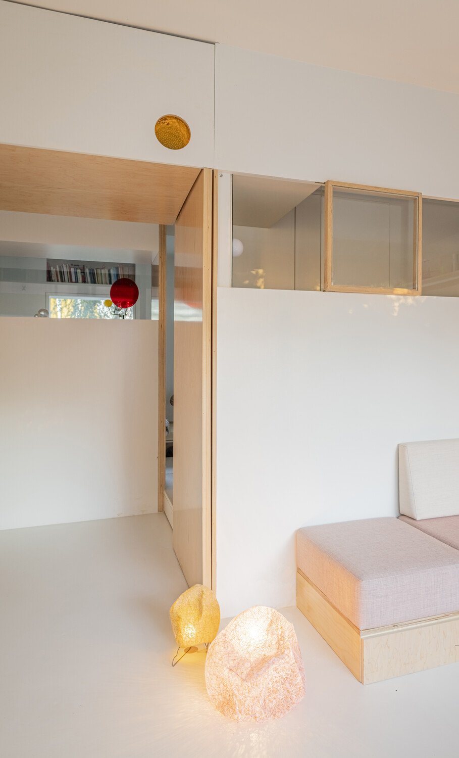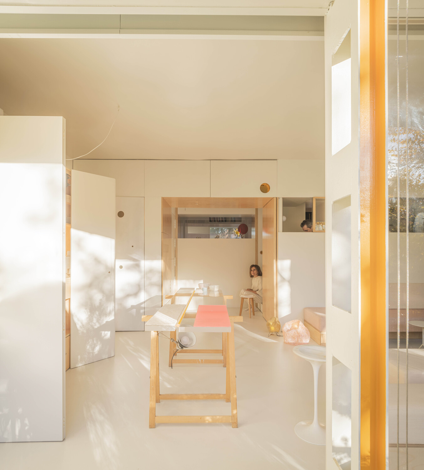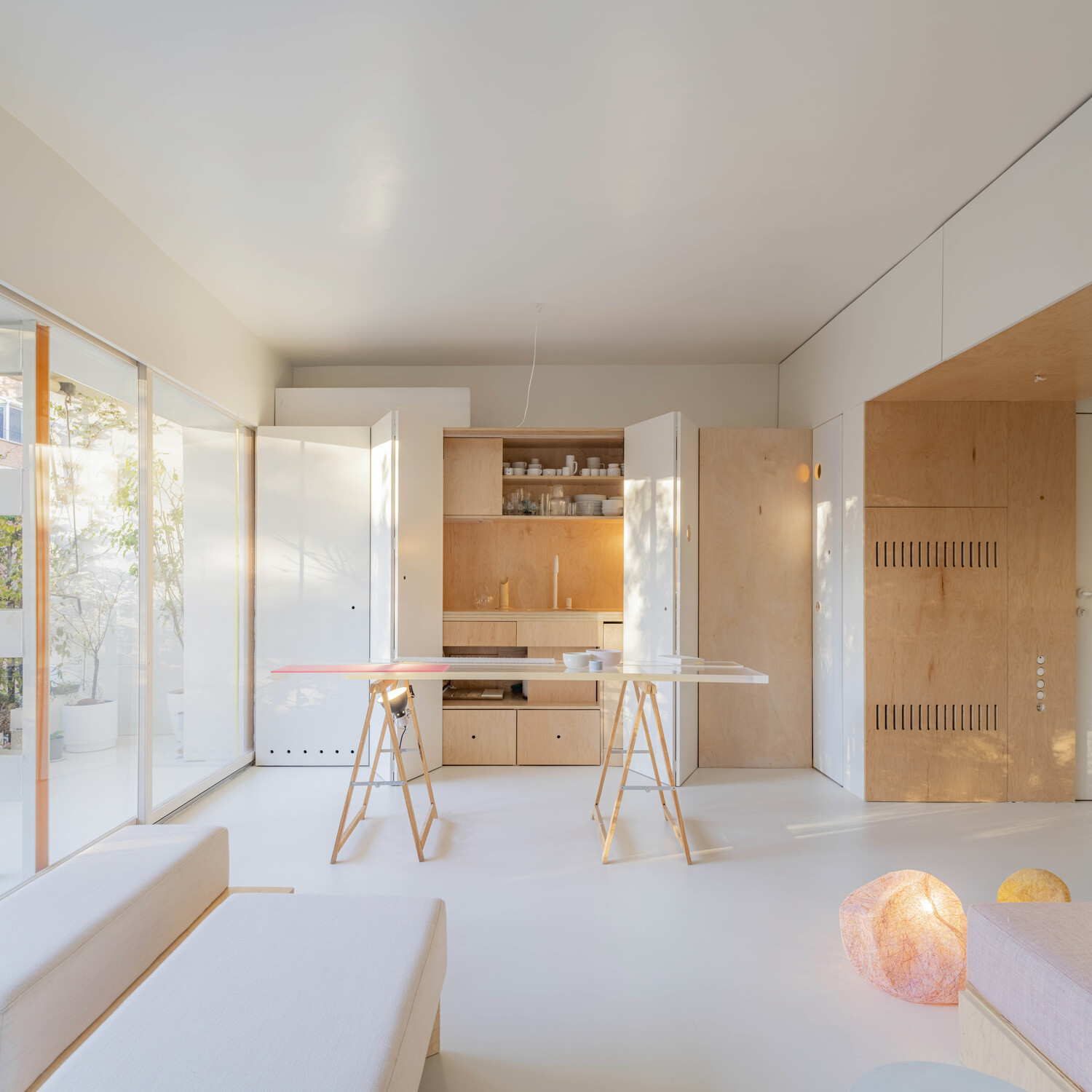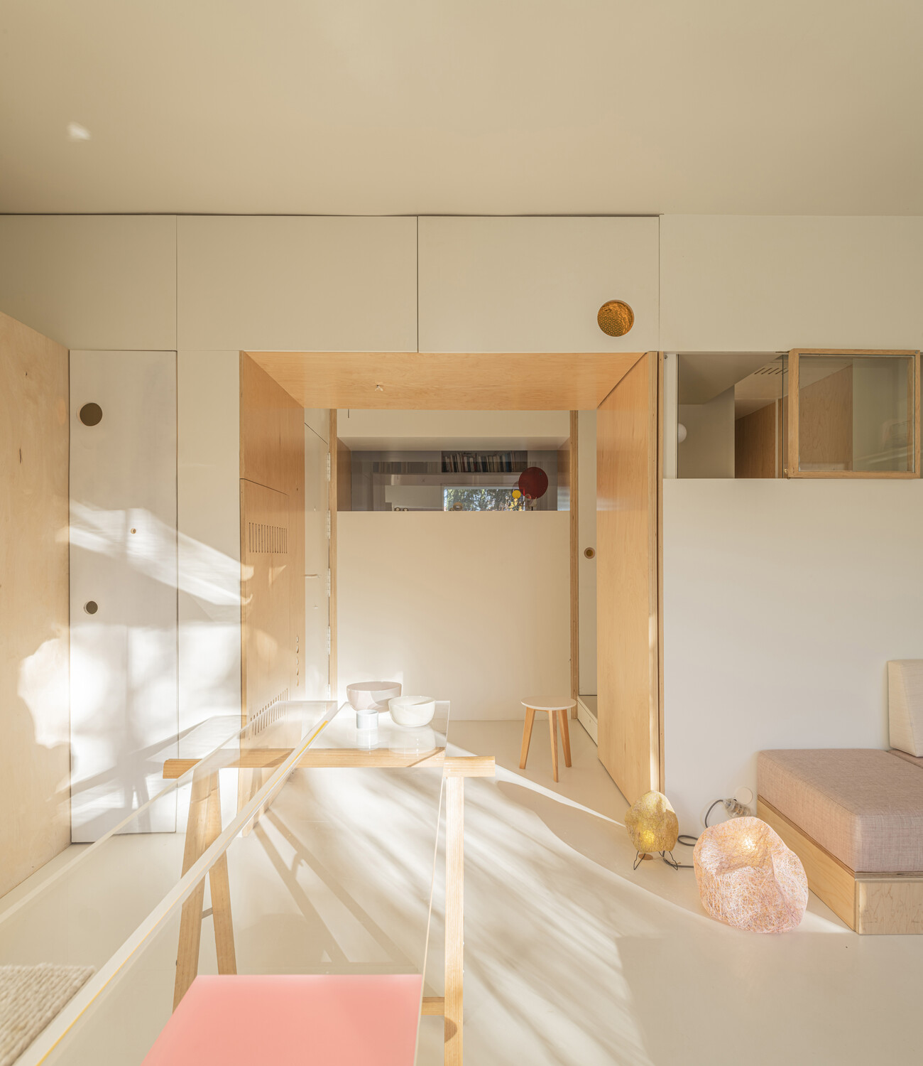 Una luz que atraviesa la casa gracias a las ventanas de los muros interiores, que aportan transparencia y una visión cruzada de la vivienda. Desde cualquier punto del apartamento, se percibe el exterior, hasta desde el cuarto de baño que se encuentra en el centro del espacio. La naturaleza invade el interior de la vivienda allá donde mires.