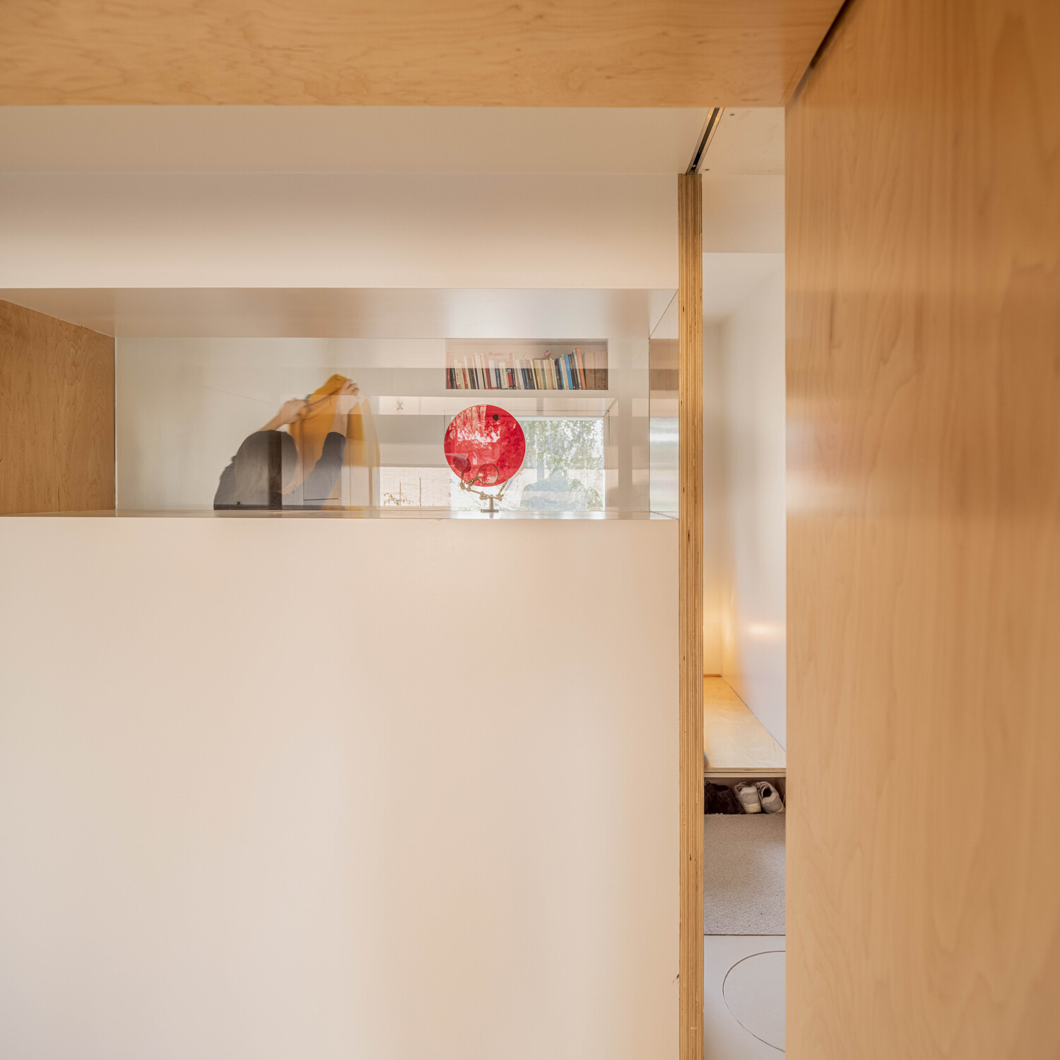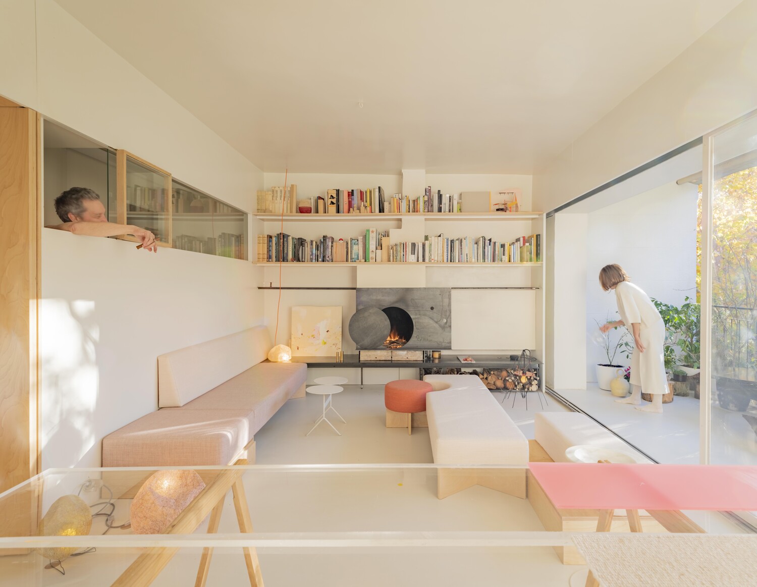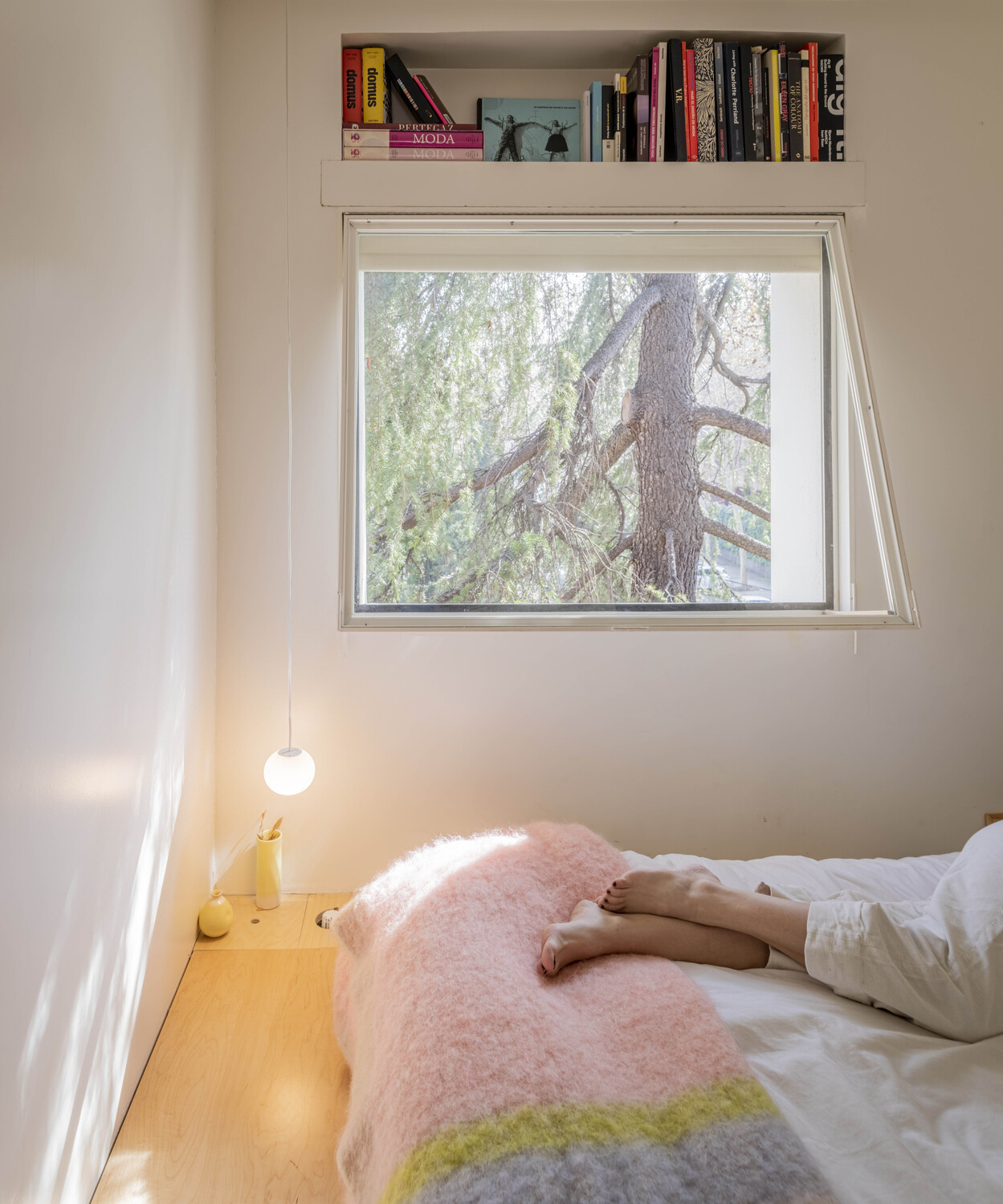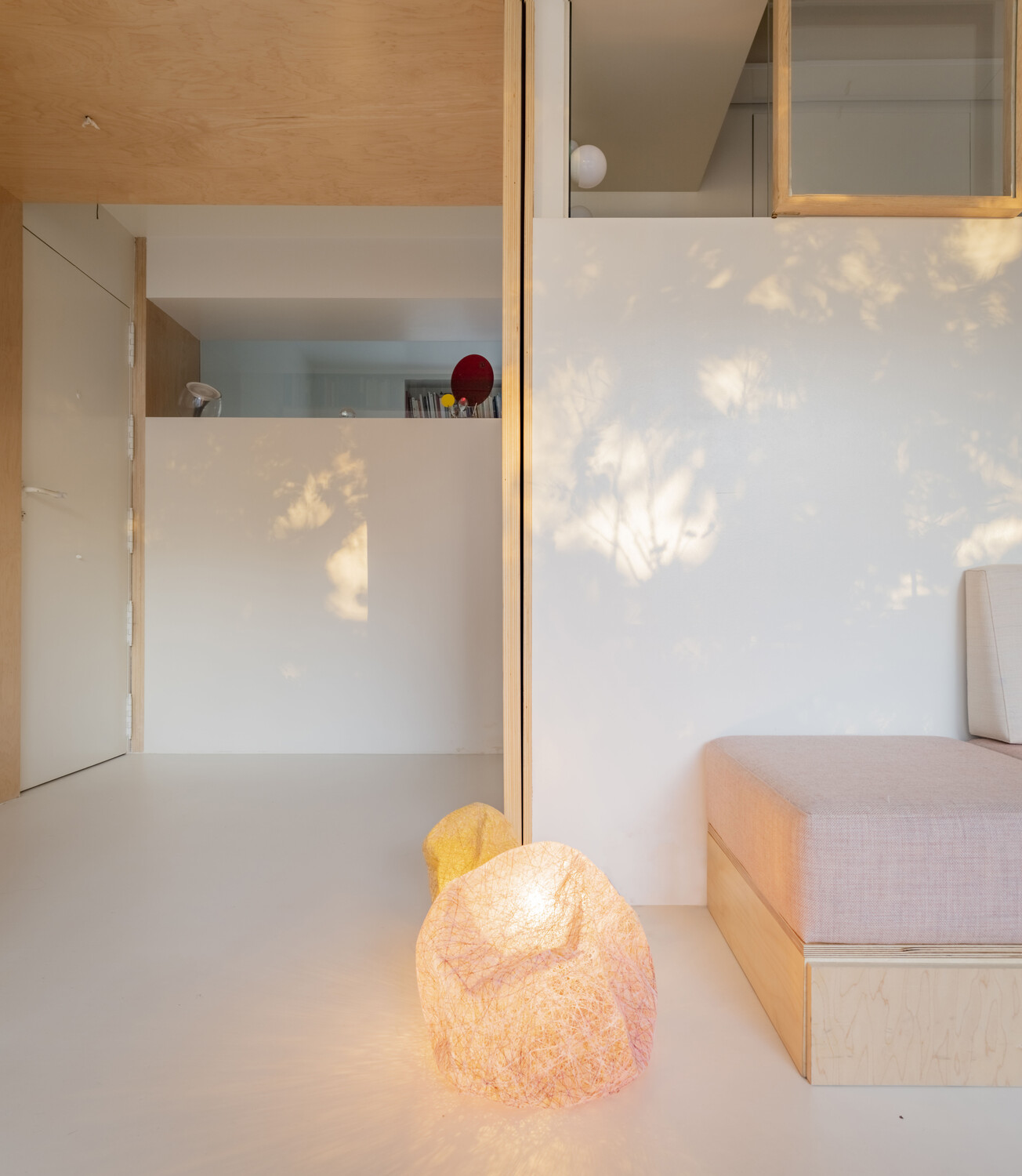 Una luz que atraviesa la casa gracias a las ventanas de los muros interiores, que aportan transparencia y una visión cruzada de la vivienda. Desde cualquier punto del apartamento, se percibe el exterior, hasta desde el cuarto de baño que se encuentra en el centro del espacio. La naturaleza invade el interior de la vivienda allá donde mires.