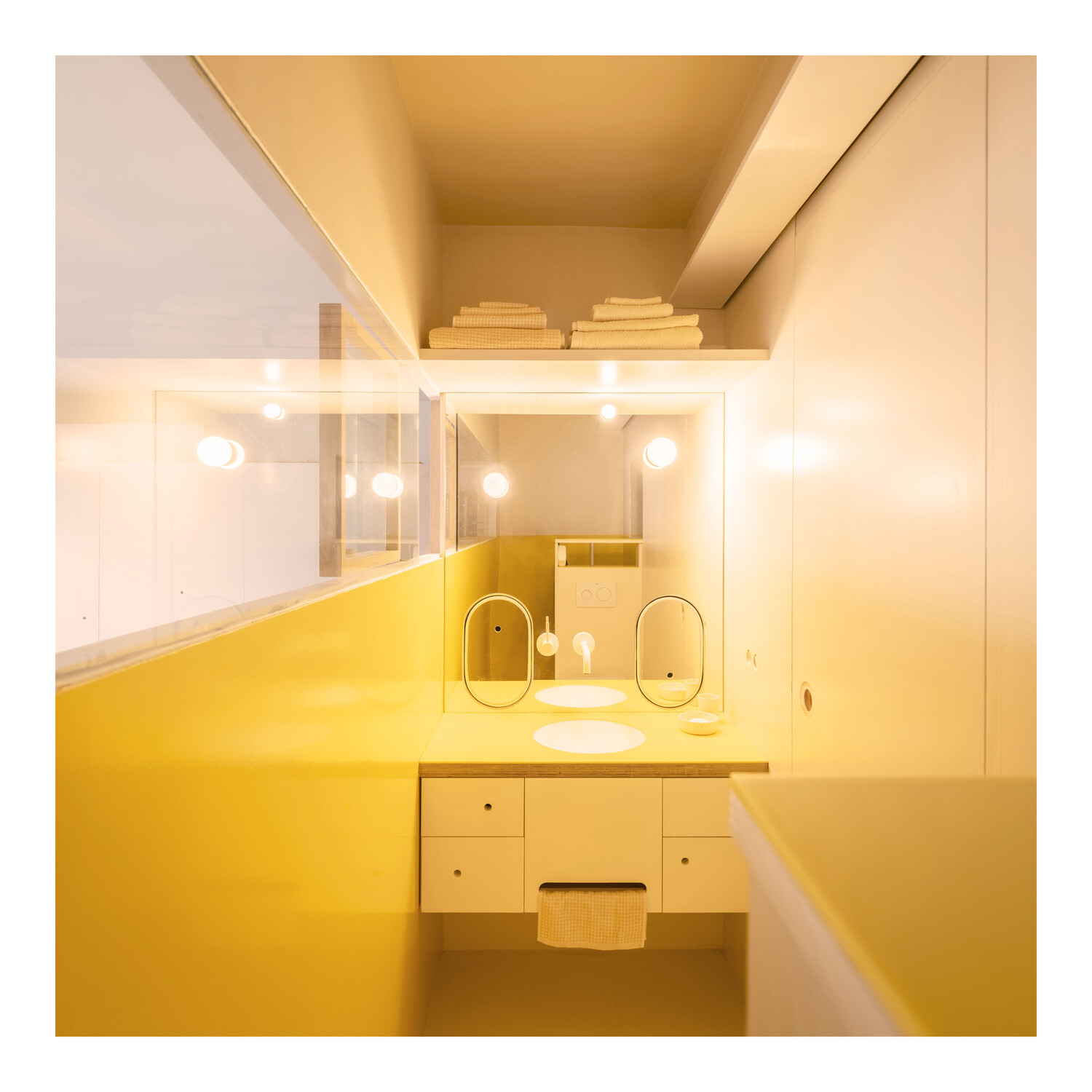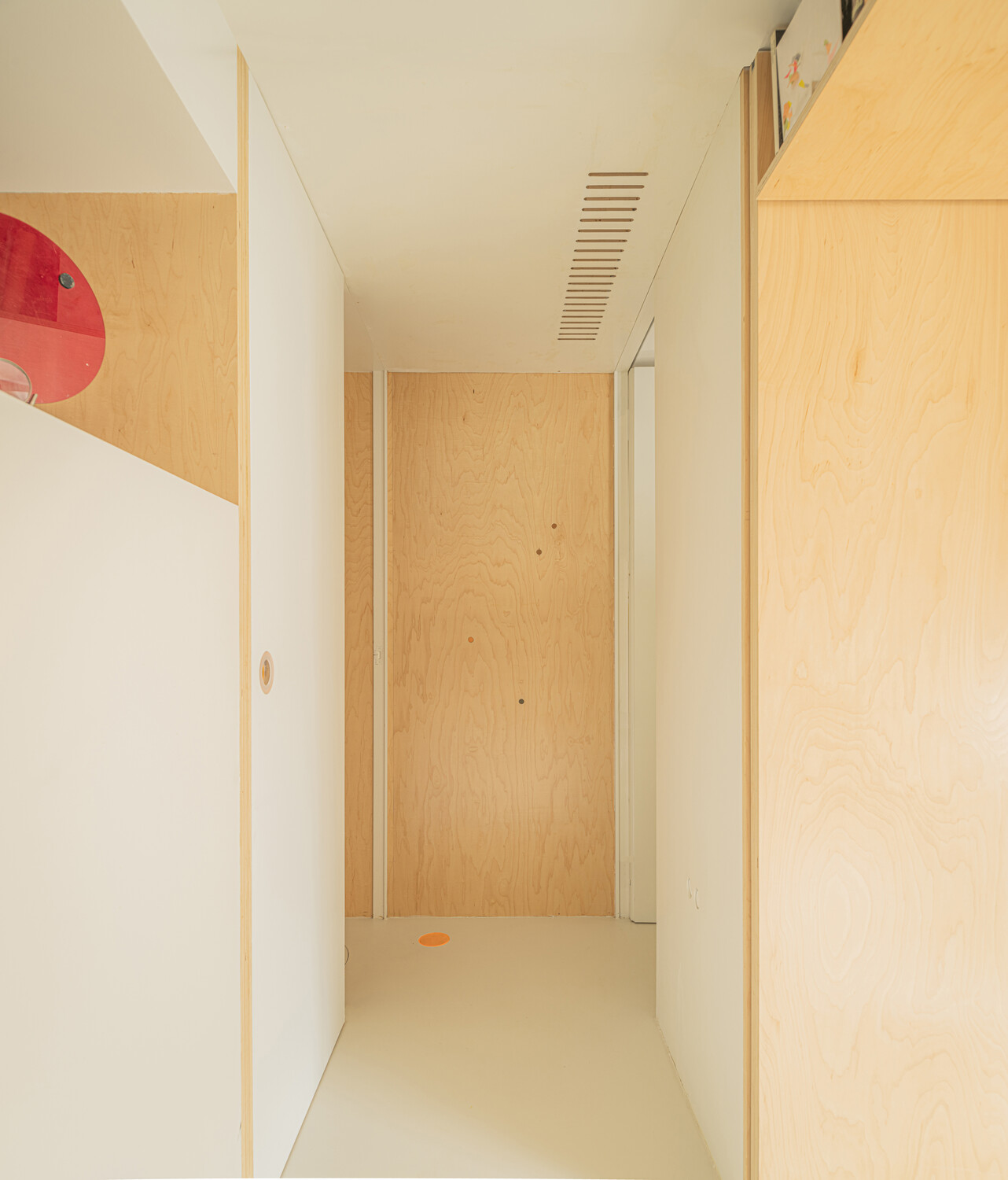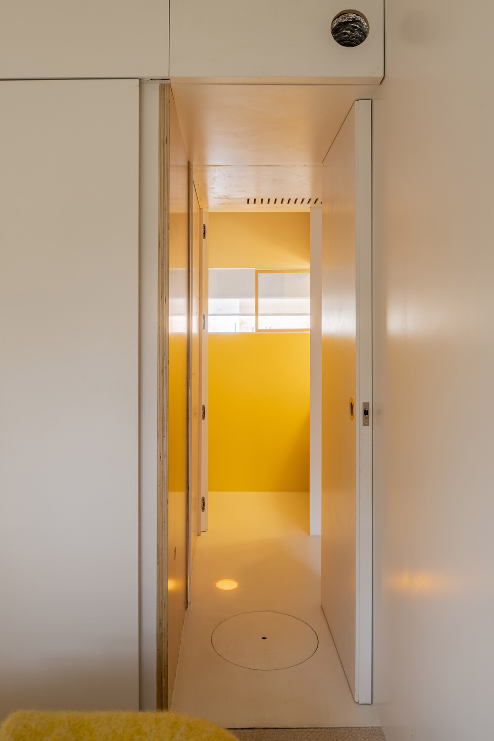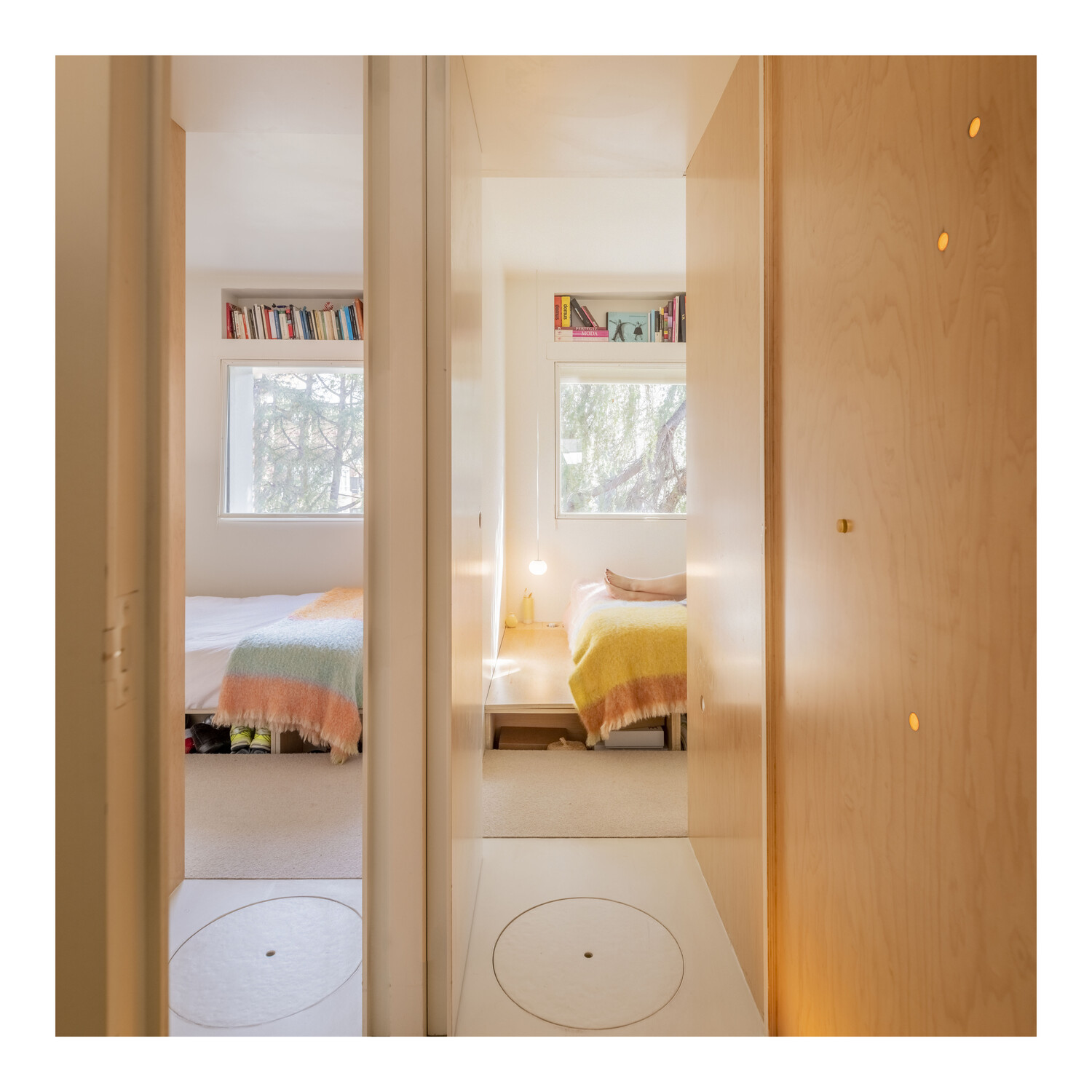 Los puntos de luz artificial también llegan desde círculos en las puertas de los armarios, en el suelo, en el espejo del baño… Puntos de luz que buscan su camino para alumbrar el hogar.