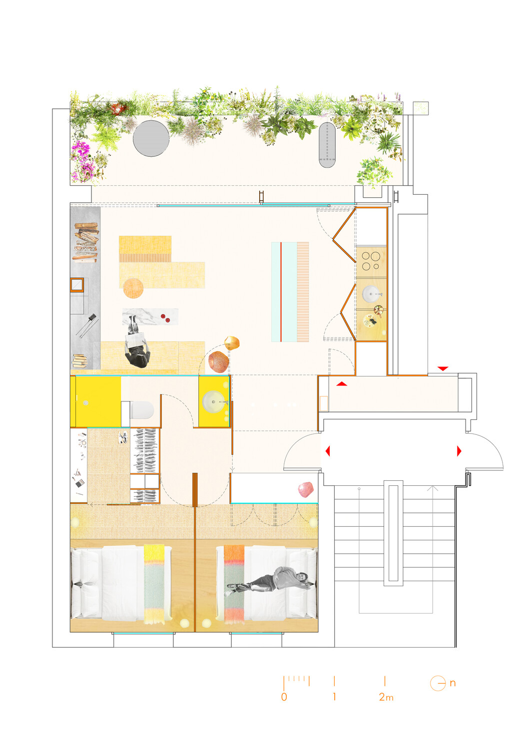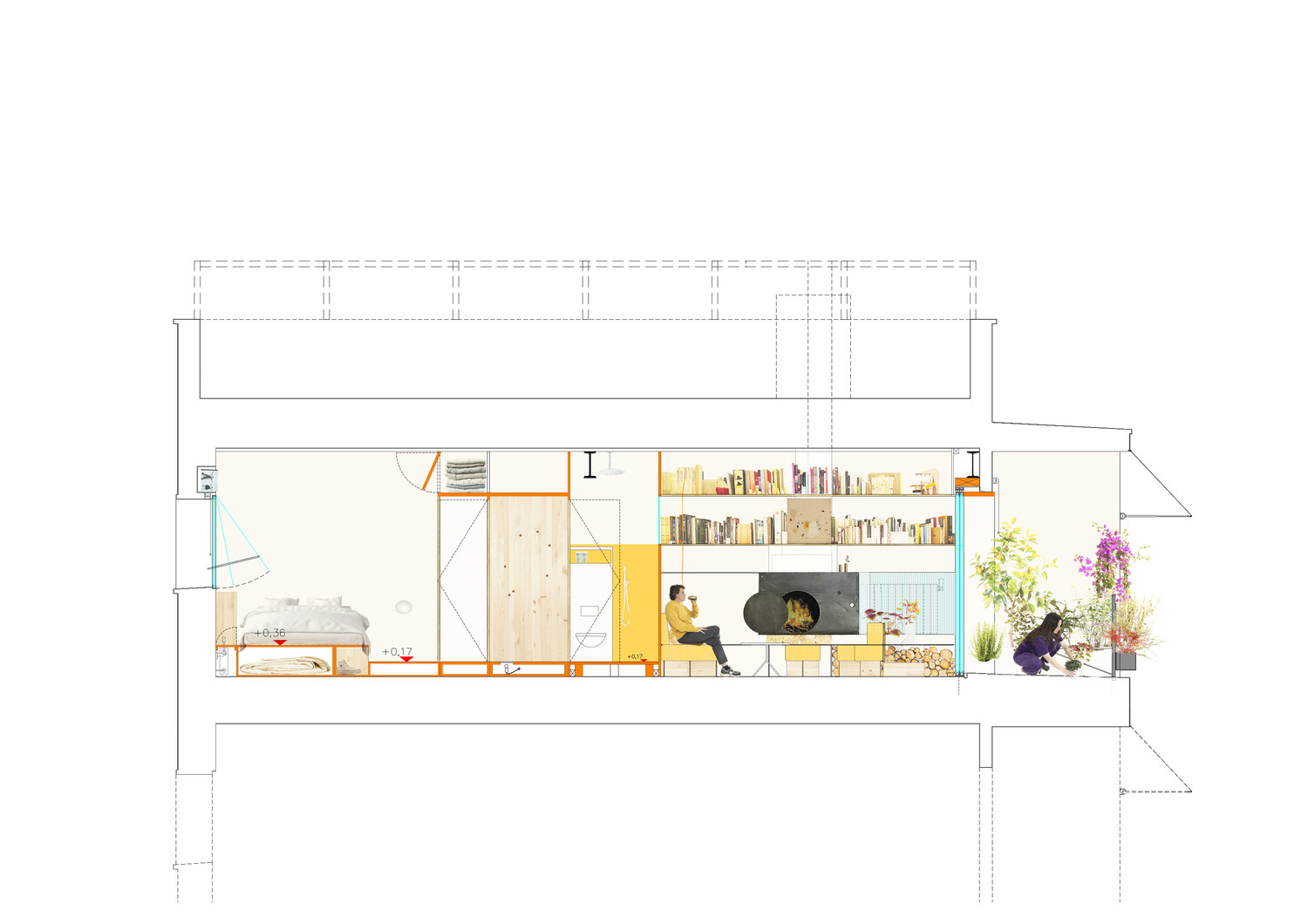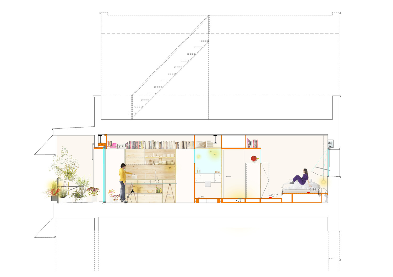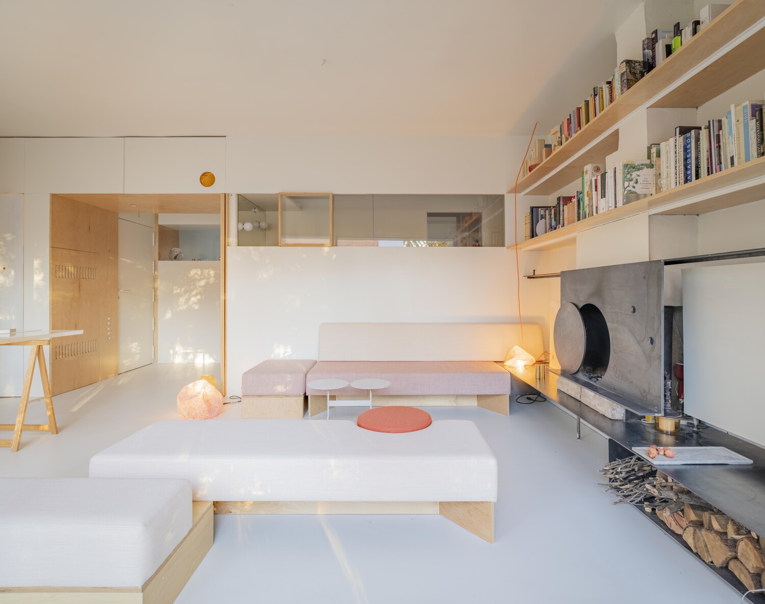 Las diferencias de altura en la vivienda hacen percibir cada estancia de una forma diferente. Estos desniveles ayudan a crear espacios para almacenamiento.